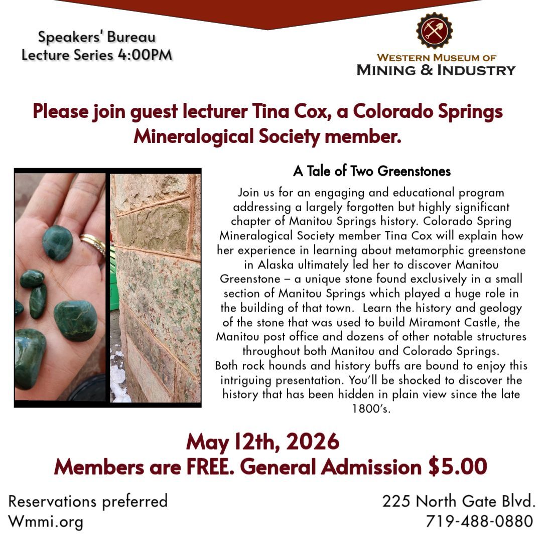 Join us for an engaging and educational program addressing a largely forgotten but highly significant chapter of Manitou Springs history. Colorado Spring Mineralogical Society member Tina Cox will explain how her experience in learning about metamorphic greenstone in Alaska ultimately led her to discover Manitou Greenstone – a unique stone found exclusively in a small section of Manitou Springs which played a huge role in the building of that town. Learn the history and geology of the stone that was used to build Miramont Castle, the Manitou post office and dozens of other notable structures throughout both Manitou and Colorado Springs.